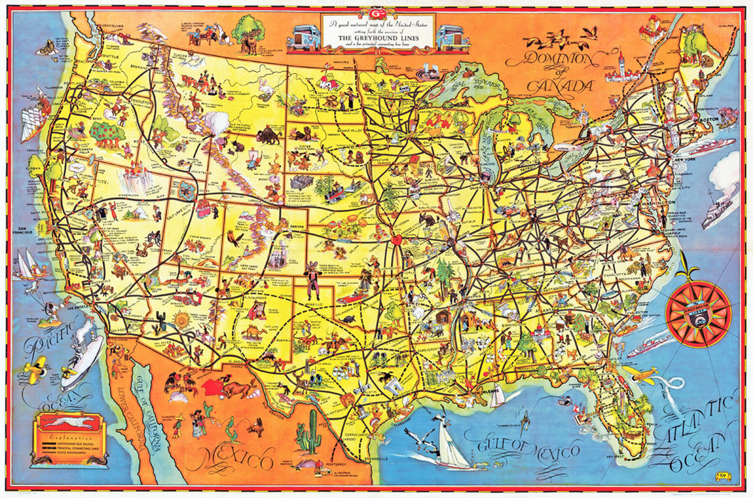 Source : www.ziprecruiter.comA Good Natured map of the United States by: Greyhound 1934